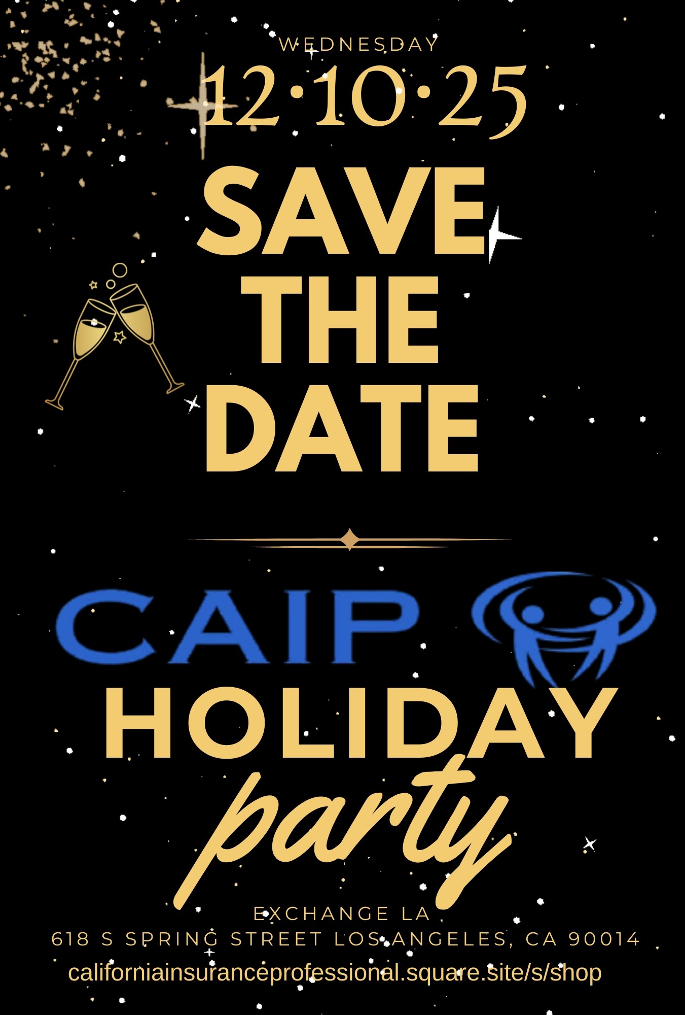 Holiday Party Next Event Event Date: December 10, 2025 Event Time: 5:00pm to 8:00pm Location Name: Exchange LA Address: 618 S Spring St, Los Angeles, CA, 90014 Registration & Sponsors: https://californiainsuranceprofessionals.square.site/s/shop Share